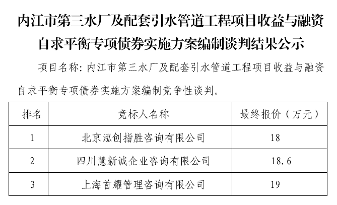 內(nèi)江市第三水廠及配套引水管道工程項(xiàng)目收益與融資自求平衡專項(xiàng)債券實(shí)施方案編制談判結(jié)果公示