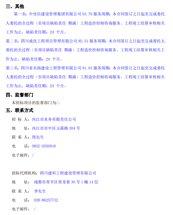 內江市應急供水搶險基地工程項目新城片區、高新區白馬園區標段全過程工程造價控制咨詢服務中標候選人公示