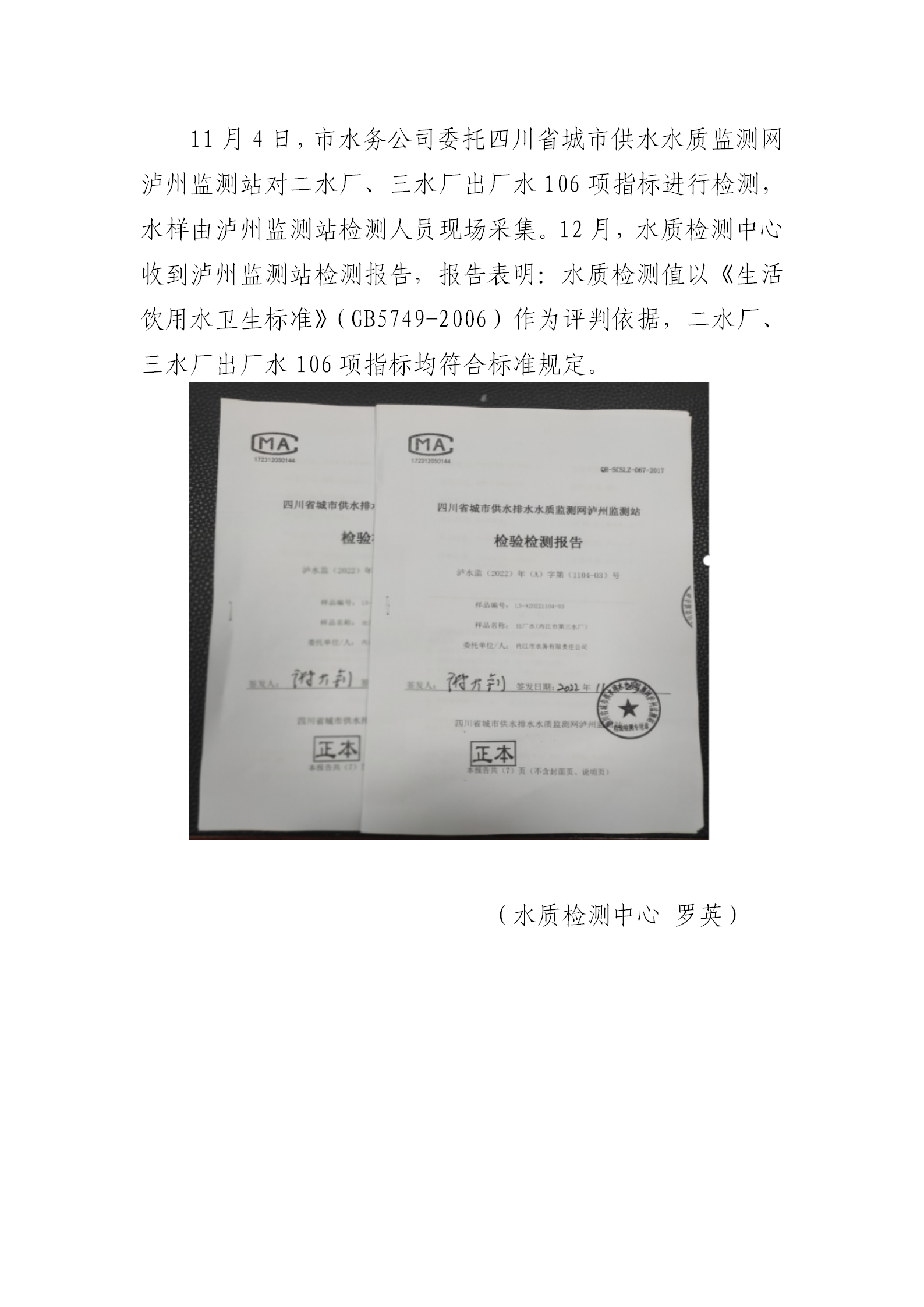 二水廠、三水廠出廠水106項指標 符合國家標準要求