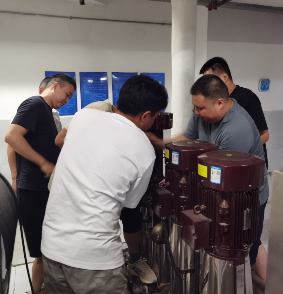 6月中旬,該小區(qū)有用戶反映水壓不穩(wěn)定。豪鵬二次供水公司收到信息立即組織人員前往現(xiàn)場排查,確認(rèn)是一臺(tái)水泵電機(jī)出了故障,引發(fā)電壓波動(dòng)所致。面對(duì)突發(fā)情況,公司迅速響應(yīng),立即組織人員對(duì)故障電機(jī)進(jìn)行拆解維修。6月17日下午,維修工作進(jìn)入電機(jī)重新安裝的關(guān)鍵階段,公司抓住這次實(shí)戰(zhàn)機(jī)會(huì),組織5名青年員工參與到此次技術(shù)練兵。通過此次培訓(xùn),員工們不僅掌握了電機(jī)維修與安裝的相關(guān)理論和維護(hù)技巧,更在實(shí)戰(zhàn)中深化了對(duì)二次供水設(shè)施運(yùn)行原理的理解。