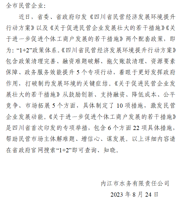 內江市“四川省民營經濟‘1+2’政策”告知書